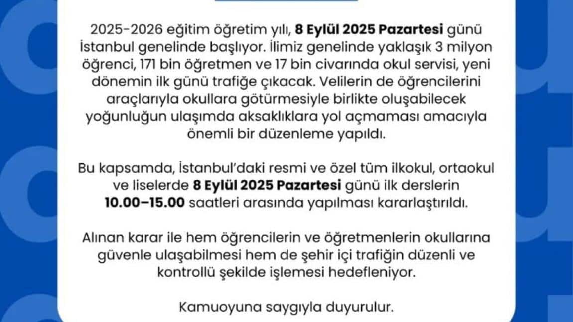 8 Eylul 2025 pazartesi gunu Trafik Yogunlugu sebebiyle Valilik Karari ile Okullarimiz 10:00'da baslayacaktir.